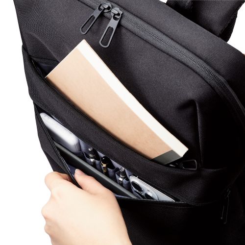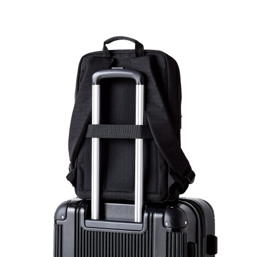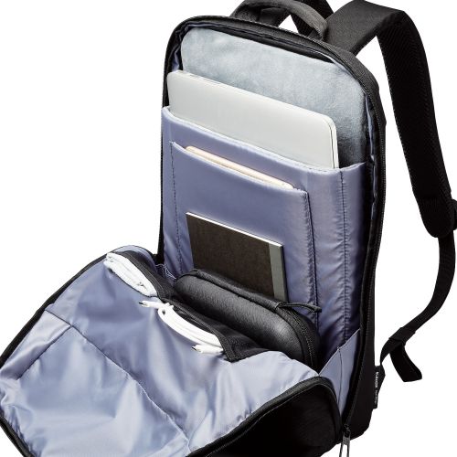 ■背負ってもスリムなシルエットを保つことができる、薄型のビジネスバックパックです。 ■背負うことで両手が空くため、雨の日や自転車移動などの際も快適に動けます。 ■15.6インチのパソコンなどが収納できる内装ポケットには、端末を優しく保護するフリース素材を採用。移動中の揺れによる中の荷物との衝突を防ぎます。 ■容量:約12L ■外形寸法:約W285×約D100×約H420mm ※ハンドル・ショルダーベルト含まず ■気室数:1(メイン気室) ■内寸:パソコン用オープンポケット:約W255×約D27×約H365mm ※15.6インチノートパソコンの参考収納寸法 ■パソコン収納部内寸備考:※内寸と収納できるパソコンの外寸は異なる場合がございます。 ■ポケット(前面):ファスナーポケット×1、仕分けスリーブ付きファスナーポケット×1 ■ポケット(気室内):パソコン用オープンポケット(起毛)×1、タブレット用オープンポケット(起毛)×1、オープンポケット(ストレッチメッシュ)×2 ■カラー:ブラック ■材質:ポリエステル ■質量:約480g ■対応モデル:~15.6インチ ノートパソコン ■表面加工:撥水加工(表生地)