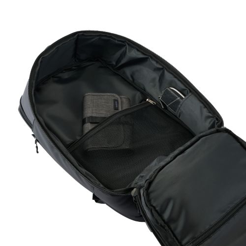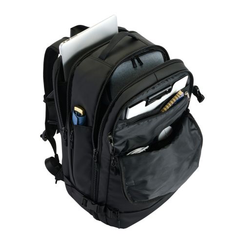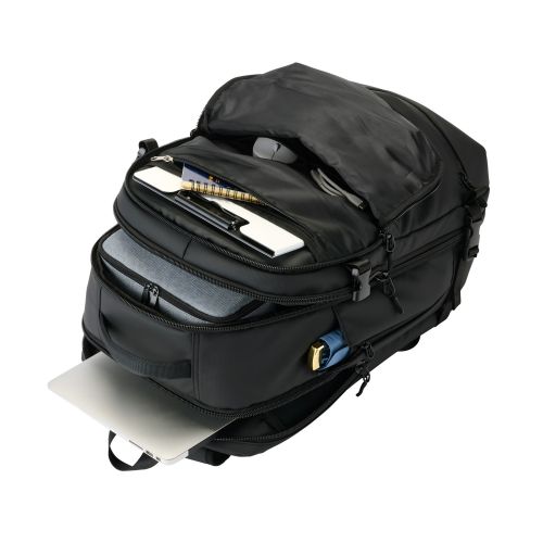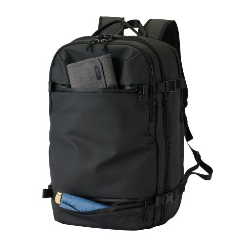 ■シューズの収納に便利なポケットを底面に備え、他の荷物と分けて収納可能。濡れた衣類やジム用品の持ち運びにも便利です。 ■外形寸法:W約330mm×D約210mm×H約510mm ※ハンドル・ショルダーベルト含まず ■内寸:W約290mm×D約26mm×H約370mm ※16.0インチノートパソコンの参考収納寸法 ■対応モデル:16インチまでのノートパソコン ■パソコン収納部内寸備考:※W約290mm×D約26mm×H約370mmが対応端末サイズとして最大です。これより小さい寸法の端末の収納に対応します。一部の端末は対応しない場合があり、保証の限りではありません。 ■ポケット(前面):ファスナーポケット×2、ファスナーポケット(シューズ収納用)×1 ■ポケット(側面):オープンポケット×1 ■ポケット(気室内):前気室:オープンポケット(ストレッチメッシュ)×2・オープンポケット×1・ファスナーポケット×1、メイン気室:ファスナーポケット(メッシュ)×1・ファスナーポケット×1、パソコン気室:パソコンスリーブ(ストレッチ)×1 ■ポケット(背面):ファスナーポケット×1 ■容量:約35L ■材質:ポリエステル、ポリウレタン ■重量:約1680g ■表面加工:PUコーティング ■カラー:ブラック