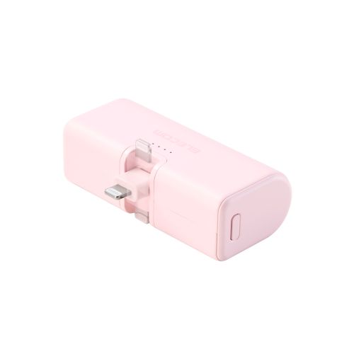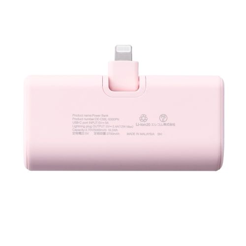 モバイルバッテリー/リチウムイオン電池/直挿し/180度スイングコネクタ/12W/5000mAh/USB-C/Lightningコネクタ/ピンク