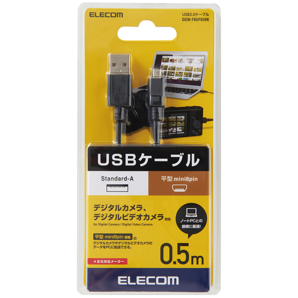 ■平型mini8pinを搭載したデジタルカメラやデジタルビデオカメラのデータをパソコンに転送できるUSBケーブルです。 ■USB2.0規格の伝送速度480Mbpsの高速データ転送に対応しています。 ■高周波ノイズを吸収する効果があるフェライトコアが付いています。 ■サビなどに強く信号劣化を抑える金メッキピンを採用しています。 ■外部ノイズの干渉から信号を保護する2重シールドケーブルを採用しています。 ■EUの「RoHS指令(電気・電子機器に対する特定有害物質の使用制限)」に準拠(10物質)した、環境にやさしい製品です。 ■ケーブルの長さはノートパソコンとの接続に最適な0.5mです。 ■コネクタ形状:USB2.0(Standard-A)オス-平型mini8pinオス ■対応機種:USB2.0(Aタイプ)端子搭載のパソコン、ACアダプタ及び平型mini8pin端子搭載のデジタルカメラ、デジタルビデオカメラ ■ケーブル長:0.5m ■ケーブル太さ:約3.1mm ■対応転送速度:最大480Mbps※理論値 ■プラグメッキ仕様:金メッキピン ■シールド方法:2重シールド ■カラー:ブラック