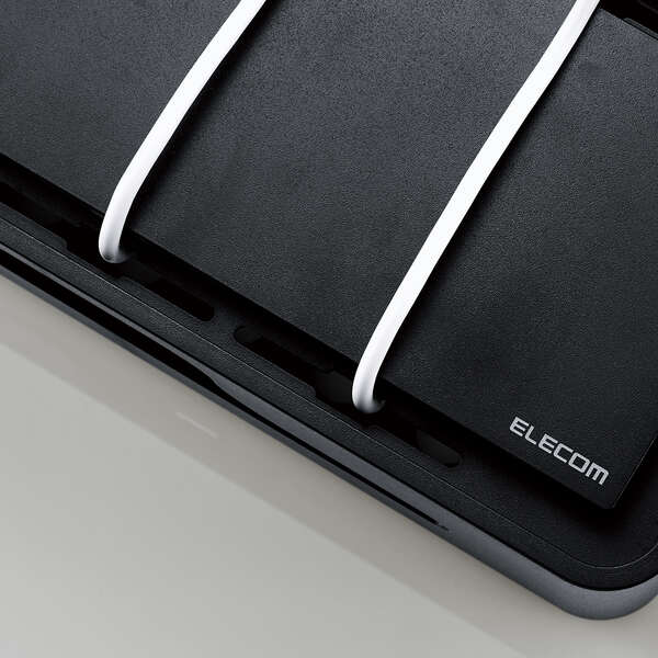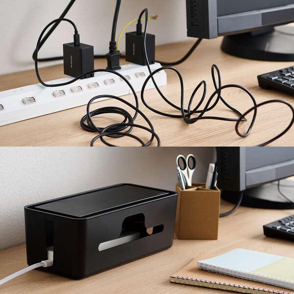 ■デスクの上のケーブルや端末をスッキリ整理できる、コンパクトで場所を取らないケーブルボックスです。 ■4~6個口の電源タップを収納可能です。※形状によっては収納できない場合もあります。 ■タブレット・スマホを立てられるスタンド機能を備えています。 ■天面のフタには、充電端子を通せるコードホールが6箇所設けられています。 ■ボックスの左右どちらからでもコード類を出せるよう、両側面にスリットを施しています。 ■収納したタップのスイッチ操作やケーブルの出し入れが可能な、内部アクセススリットを備えています。 ■ボックス底面には、内部の温度上昇を緩和するスリットを施しています。 ■ボックス底面には、設置時の横滑りや接地面への傷を緩和するシリコンクッションを備えています。 ■サイズ:外形寸法 約幅310×奥行140×高さ110mm※蓋を嵌めた状態 ■サイズ:収納内寸 約幅280mm×奥行110mm×高さ95mm※蓋を嵌めた状態 ■重量:約390g ■材質:ABS樹脂 ■カラー:ブラック ■その他:天面コードホール×6 ■その他:側面スリット×3 ■その他:スタンド機能使用時の推奨端末厚み:10mm以下