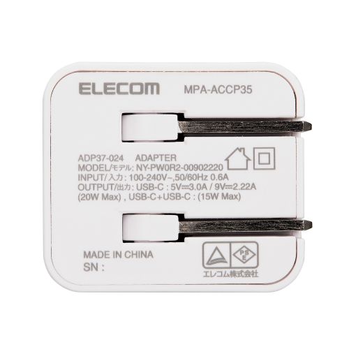 ■USB Type-C(USB-C)ポートを2ポートを搭載し対応するスマートフォン、タブレットなどを超高速充電できるUSB AC充電器です。 ■手のひらにすっぽり隠れるほど小さく軽量なので、出張などの外出時の持ち運びに便利です。 ■対応機種:USB Type-C(USB-C)ポートからUSB Power Delivery 3.0(20W)の規格内で充電が可能な機器。 ■コネクタ形状:USB Type-C(USB-C)ポート×2 ■定格入力電圧:AC100-240V 50/60Hz ■定格入力電流:0.6A ■定格出力電力:USB Type-C(USB-C)ポート:最大出力20W、2ポート同時出力時:合計最大15W(USB Power Deliveryでの出力はできません) ■定格出力電圧:USB Type-C(USB-C)ポート:5V/9V、 2ポート同時出力時:各5V ■定格出力電流:USB Type-C(USB-C)ポート使用時:5V時3A / 9V時2.22A、2ポート同時出力時:合計最大15W ■外形寸法:幅約40mm×厚み約29mm×高さ約33mm ■重量:約48g ■カラー:ホワイト ■使用可能地域:日本 ■保証期間:1年 ■コンセントプラグ仕様:90度スイング構造 ■使用温度範囲:0℃~40℃ ■法令:◇PSE 特定電気用品 ■その他:※USB Type-C and USB-C are trademarks of USB Implementers Forum