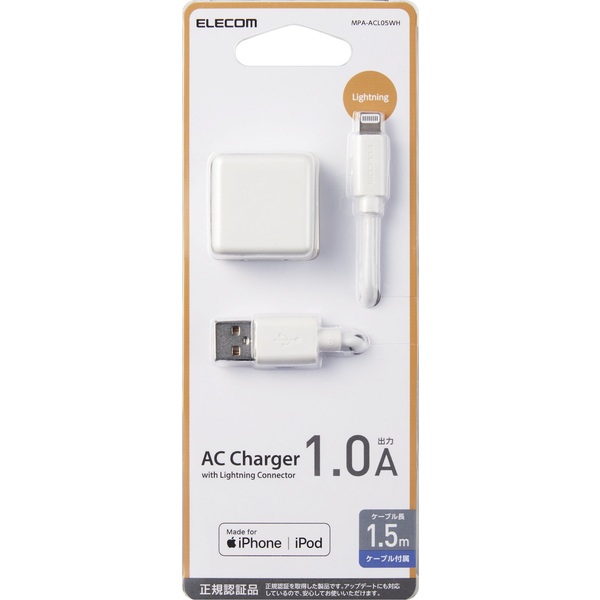 | 商品名 | Lightning-AC充電器/1.0A出力/ケーブル同梱/1.5m/ホワイト |