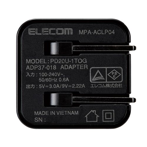 ■USB Power Deliveryに対応したUSB Type-C(USB-C)ポートを搭載し、付属のLightningケーブルに対応したLightningコネクター搭載のiPhone、iPad、iPodを超高速充電できるLightningケーブルを付属したUSB AC充電器です。 ■手のひらにすっぽり隠れるほど小さく(約35mm×27.5mm×28.5mm)、軽量(約39g本体のみ)なので外出や出張などの際の持ち運びに便利です。 ■対応機種:USB Type-C(USB-C)ポートからUSB Power Delivery 3.0(20W)の規格内で充電可能な端末。 ■コネクタ形状:USB Type-C(USB-C)ポート×1 ■定格入力電圧:AC100-240V 50/60Hz ■定格入力電流:0.6A ■定格出力電力:20W ■定格出力電圧:5V/9V ■定格出力電流:5V時3A/9V時2.22A ■外形寸法:幅約35mm×厚み約27.5mm×高さ約28.5mm ■重量:約39g (本体のみ) ■ケーブル長:約1.5m ■カラー:ブラック ■使用可能地域:日本 ■保証期間:1年 ■コンセントプラグ仕様:90度スイング構造 ■使用温度範囲:0℃~25℃ ■付属品:USB Type-C(USB-C) to Lightningコネクターケーブル ■認証:MFi ■法令:◇PSE 特定電気用品 ■その他:※USB Type-C and USB-C are trademarks of USB Implementers Forum