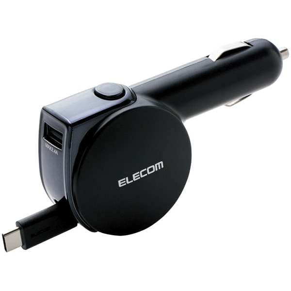 シガーチャージャー/Type-C/リールタイプ/USBポート付/おまかせ充電/90cm/5.4A/ブラック