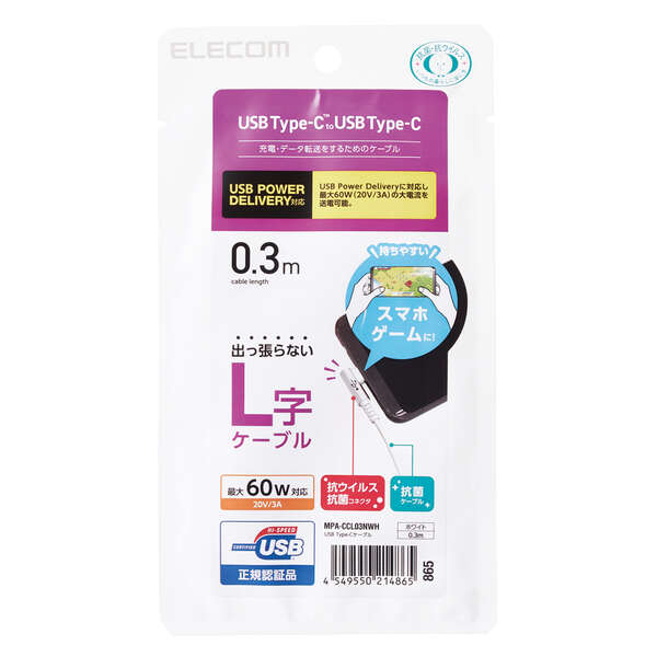 | 商品名 | USB Type-Cケーブル/スマホ用/USB(C-C)/USB Power Delivery対応/認証品/L字コネクタ/抗菌・抗ウイルス/0.3m/ホワイト |