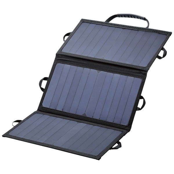 ■防災・アウトドアに最適。太陽光に当てるだけで充電ができるモバイルソーラー充電器です。 ■ソーラーパネル種類:Maxeon Solar Technologies社製MAXEONセル ■ソーラーパネル枚数:3枚 ■ソーラーパネル発電性能:最大21W ■ソーラーパネル変換効率:最大22% ■コネクタ形状(電源出力側):USB-A (メス) x2 ■定格出力電圧:5V ■定格出力電流:合計2.4A 各1ポート2.4A ※日光の強さによって、発電量が変化します。また、設置方法や季節、天候、時刻、気温などの充電環境によって、必要な出力が得られない場合があります。 ■使用温度:0~40 ℃ ■保存温度:-20~70 ℃ ■外形寸法:折りたたみ時 [幅]約150×[厚み]約35 × [高さ]約285 mm、 展開時 [幅]約465×[厚み]約25 × [高さ]約285 mm (持ち手・吊り下げ用ループを除く) ■重量:約450g ■表面素材:ポリエステル (生地部分) 、PET (ソーラーパネル表面) ■カラー:ブラック ■付属品:USB-A (オス) - Micro-B (オス) ケーブル (約0.5m)、Micro-B (メス) - Type-C (オス) 変換アダプタ、取扱説明書 ■保証期間:1年間 ■その他:iOS用ケーブル及びバッテリーは付属しておりません ご使用の場合は別途ご用意ください