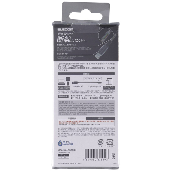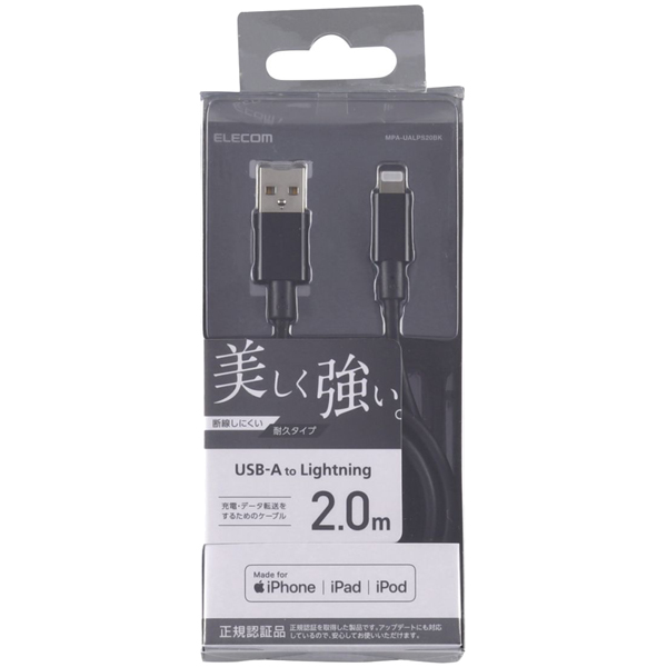■iPhoneやiPod、iPadなどのLightning端子搭載機器とパソコンを接続し、充電・データ通信が可能なLightningケーブルです。※iPadはパソコンからは充電できません。 ■コネクタ形状1:Lightning(オス) ■コネクタ形状2:USB-A(オス) ■長さ:2.0m ※コネクター含まず ■使用目的・用途:USB(A)端子を持つパソコン及びAC充電器とLightning端子を搭載したiPhone、iPad、iPodを接続し、充電・データ転送が可能です。※iPadはパソコンからは充電出来ません。 ■対応機種:iPhone 14 Pro Max/14 Pro/14 Plus/14/13 Pro Max/13 Pro/13/13 mini/12 Pro Max/12 Pro/12/12 mini/SE(2nd generation)/11 Pro Max/11 Pro/11/XS Max/XS/XR/X/8 Plus/8/7 Plus/7/SE/6s Plus/6s/6 Plus/6/5s、iPad Pro 10.5-inch/Pro 12.9-inch(2nd generation)/Pro 9.7-inch/Pro 12.9-inch(1st generation)/Air(3rd generation)/Air 2/Air/mini(5th generation)/mini 4/mini 3/mini 2/iPad(9-5th generation)、iPod touch(7-6th generation)、AirPods(第1~3世代)/AirPods Pro/AirPods Pro(第2世代)/AirPods Max ■パッケージ:PET折り箱 ■カラー:ブラック ■保証期間:1年