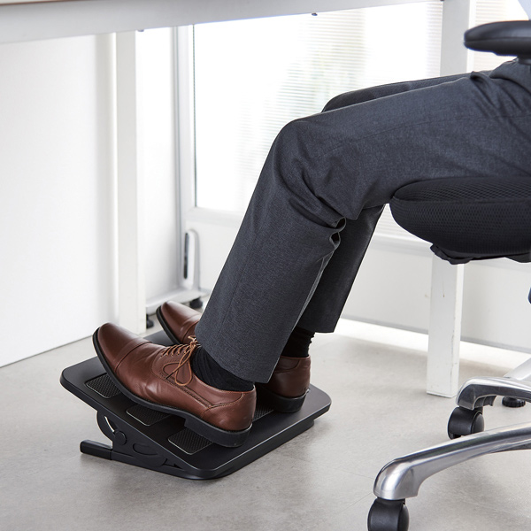 ■足を乗せることでデスクワーク時の姿勢改善、足への負担を軽減できるフットレストです。 ■フットレストに足を乗せることで太ももへの圧迫を軽減できます。 ■座り方やイスの高さに合わせて前後-20°~20°の角度に無段階調整可能です。※フットレストの角度の固定はできません。 ■可動範囲内で足と足首を動かしリフレッシュできます。 ■耐荷重性に優れたスチール製です。 ■足を乗せる面には滑り止め加工が施されています。 ■床に置いてもずれにくく、床面を傷つけない滑り止め付です。 ■耐荷重:20kg ■寸法:約幅380×奥行300×高さ80mm ※水平時 ■質量:約2.4kg ■色:ブラック ■材質:スチール、PVC