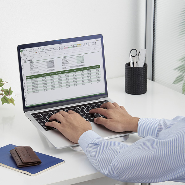 ■10.1~15.6インチノートPC対応の折りたたみ式ノートPCスタンドです。 ■厚さ4mmの堅牢で上質な仕上げのアルミ合金製のノートPCスタンドです。 ■ノートPCの画面部分を高さ約7cm上げることで目線をあげることができ、PC作業時の姿勢を改善することができます。 ■タイピングに適した傾斜角度約18°です。 ■薄型ノートPCでも操作の邪魔にならない前部ストッパー。 ■ノートPCをデスクに密着させずに置くことが出来るのでノートPCの排熱にも効果的です。 ■天板と底部にはシリコンゴムの滑り止めパッドを施しているので、滑りにくく安定してご使用いただけます。 ■不使用時には薄くたたんで収納することができます。 ■対応サイズ:10.1~15.6インチノートPC ■耐荷重:5kg ■寸法:約幅210×奥行233×高さ15mm ※折りたたみ時 ■質量:約355g ■色:シルバー ■材質:アルミ合金、シリコン