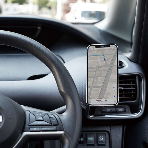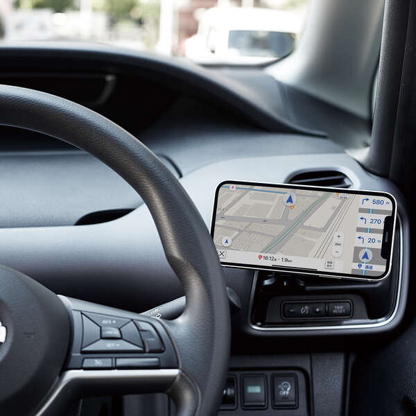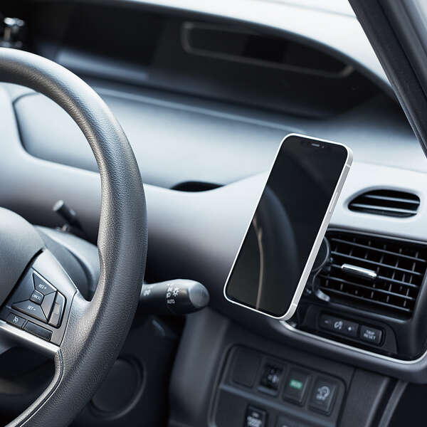 ■MagSafe対応iPhoneをマグネットで保持できる、エアコンルーバー取り付けタイプの車載ホルダーです。 ■MagSafe対応iPhoneに内蔵されているマグネットと同じ形状でマグネットを配置しているので、端末をピッタリ保持することが可能です。 ■クリップを挟み込むだけでエアコンルーバーに簡単に装着が出来ます。傾き防止パーツもついています。 ■ボールジョイントを採用していますので、360度回転や自由な角度に調整し、固定することができます。 ■スマートフォン設置部分に、本体を傷つけにくいラバー素材を使用しています。 ■最大外形寸法:幅56mm×奥行86mm×高さ93mm(展開方法による) ■重量:79g ■付属品:エアコン取付クリップ×1 ■対応機種:MagSafe対応iPhone※重量:約270g以下(ケースなどのアクセサリ含む) ■材質:ポリカーボネート/シリコン/鉄/ネオジウム磁石/TPE/ステンレス ■カラー:ブラック ■その他:エアコンルーバー取付。端末はケース未装着、またはMagSafe対応ケース装着時のみ使用可。