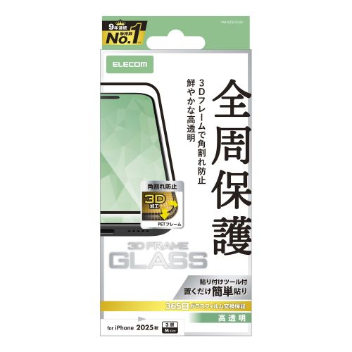 ■3D設計のPETフレームで角割れを防ぐ、画面保護ガラスフィルムです。 ■ガラスフィルムを衝撃から守るPET素材のフレームが付いており、四つ角が割れない安心設計です。 ■ガラスフィルム交換365日保証サービス付き製品です。 ■本製品をご使用の際に、フィルムの角が「欠けた」、「ヒビが入った」、「割れた」場合、ご購入より1年以内に申請いただくことで、フィルムの交換が1回可能になるサービスです。 ■※詳しくは、パッケージに記載のQR、もしくはこちら(https://www.elecom.co.jp/support/cellphone/glass_film/index2.html)にてご確認ください。 ■※ガラスフィルム交換365日保証サービスには、フィルム本体、購入日が確認できる証明書(レシートなど)が必要です。 ■高精細な画質を損ねない高い透明度を実現します。 ■表面硬度10Hの強化ガラス採用により、保護ガラス表面の傷を防止します。 ■対応機種:iPhone 17 Pro ■セット内容:画面保護ガラスフィルム(フレーム付き、高透明タイプ)×1、クリーニングクロス(乾式)×1、ホコリ取りシール×1、貼り付けツール×1 ■材質:接着面:シリコン、外側:ガラス・PET ■カラー:ブラック