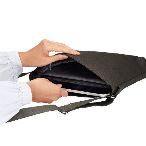 ■11インチまでのタブレットを収納可能なショルダーバッグです。 ■タブレット専用サイズでスマートなシルエットながら、お出かけに必要な荷物を十分に収納できます。 ■メイン収納部には、小物ポケット2つとファスナーポケットを1つ完備。充電器などの小物を収納するのに便利です。 ■内側には、タブレットを傷つけにくい起毛素材を使用しています。 ■タッチペンを挿して収納できるポケット付き。取りたいときにサッと取り出せ、紛失防止にもなります。 ■背面には財布など入れるのに便利なファスナーポケットが付いています。 ■肩掛けで両手が空くため、雨の日や自転車移動などの際も快適に動けます。 ■バッグタイプ:タブレットショルダーバッグ ■気室数:1気室 ■外形寸法:幅約330mm×奥行約55mm×高さ約250mm ※ショルダーベルト含まず ■ポケット数:メイン収納部(内側:ファスナーポケット×1、小物ポケット×2、タブレット収納ポケット×1)、背面ファスナーポケット×1 ■カラー:ブラック ■材質:表地:綿、裏地:ポリエステル ■質量:約330g