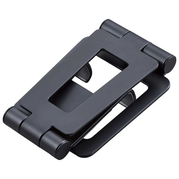 ■2箇所のヒンジで角度と高さの調整ができ、設置しているタブレットに充電ケーブルを装着できる、フリーアングルスタイルのタブレット用アルミスタンドです。 ■折りたたんでコンパクトに収納可能です。 ■インテリアになじむ、シンプルで美しく高級感のあるアルミ仕上げです。 ■およそ5.0~12.9インチのスマートフォン、タブレットに対応しています。 ■ホルダー部は自由に角度調整ができるフリーアングルタイプで、Web閲覧や動画視聴などシーンに合わせてお好きな角度で使用できます。 ■ホルダー部の受け部分は中心が開いており充電ケーブルを接続しやすくしています。 ■ホルダー部は約16mmのマチ幅があるため薄いケースであれば装着したままスタンドに設置することができます。 ■本製品の構造上、対応サイズでもバランスの悪い場合はスタンド状態を維持することができない場合がありますのでご了承ください。 ■材質:本体:アルミニウム、シリコン ■外形寸法:本体(収納時):幅約92mm×奥行き約27.6mm×高さ約134mm ■重量:約190g ■カラー:ブラック ■対応機種:5.0~12.9inch(W221mm×D16mm×H306mmまで) ■角度調節:○