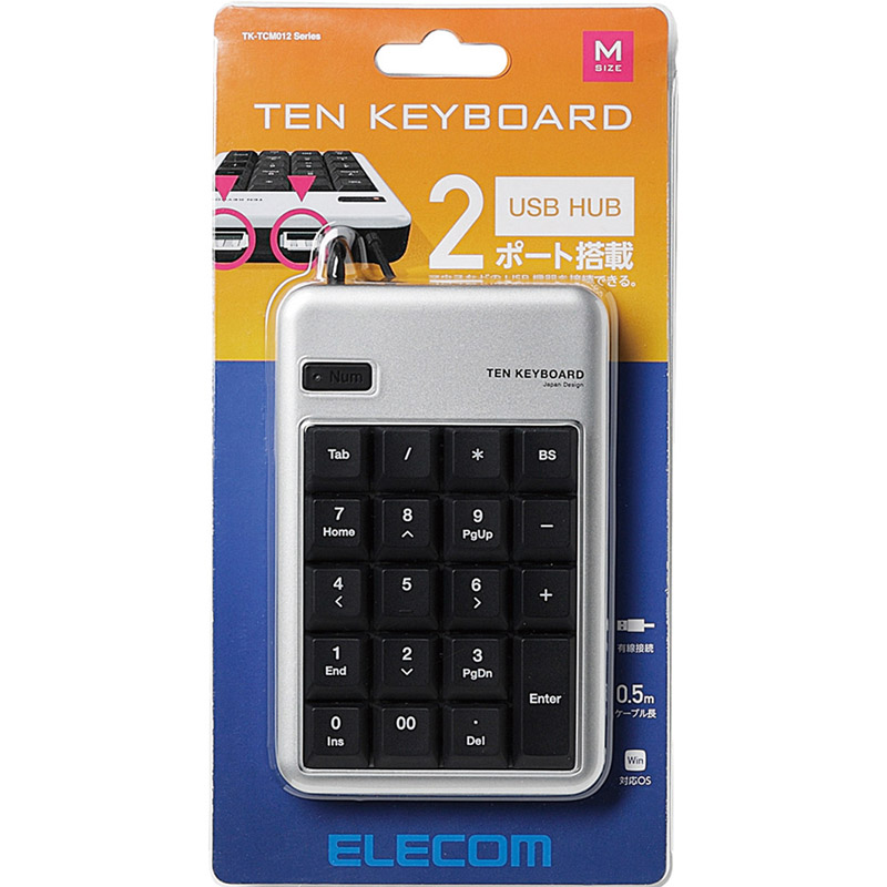 ■2ポートのUSB2.0ハブ機能を搭載し、マウスなどのUSB機器を2台まで接続できるテンキーボードです。 ■Excelでの作業に便利な[Tab]キーと、数字の入力に便利な[00]キーを装備しています。 ■大きなキーで入力効率が向上します。 ■「NumLock」問題をハードウェアで解決しており、対策ソフトのインストールは不要です。 ■NumLockのオン/オフの状態がひと目でわかるLEDランプを装備しています。 ■USB接続なので、パソコンの電源がオンの状態でも抜き差しが可能です。 ■インターフェース:USB ■コネクター形状:USB[A] ■対応機種:USBポートを装備したWindows搭載機 ■対応OS(Windows):Windows 11/10/8/8.1/RT/RT8.1/7(SP1)/Vista(SP2)/XP(SP3) ■カラー:シルバー ■キータイプ:メンブレン ■キー配列:20キー ■キーピッチ:19mm ■キーストローク:2.3mm ■アップストリーム(パソコン側)ポート数:1 ■ダウンストリーム(HUB側)ポート数:(USB2.0)×2 ■電源方式:USBバスパワー ■供給可能電流:100mA未満/1ポート ■ケーブル長:0.5m ■外形寸法:幅90×奥行140×高さ23.5mm(ケーブル除く) ■質量:約114g ■保証期間:6カ月間
