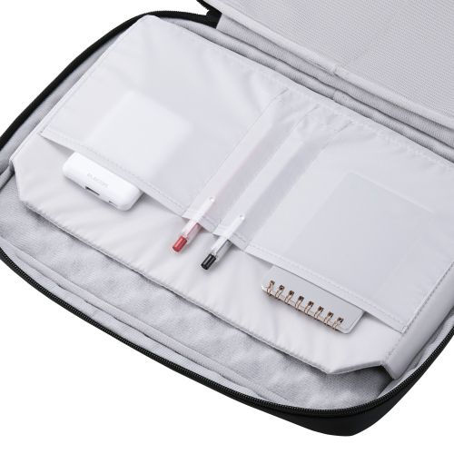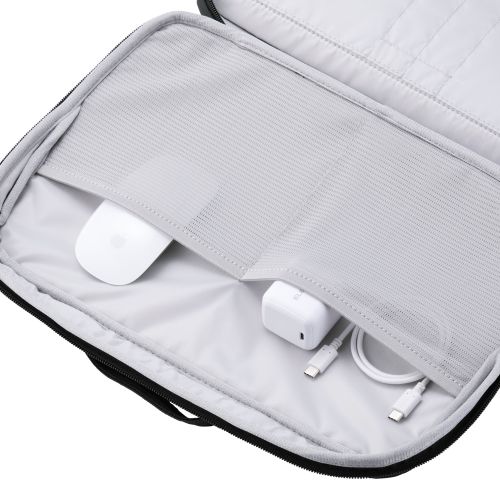 ■大切なノートパソコンを衝撃から守る“ZEROSHOCK”インナーバッグです。 ■本体内装パソコン収納部には、軽量化と衝撃吸収を両立する低反発ウェーブカットウレタンフォームを内蔵しています。 ■表面生地は、マットな質感で落ち着いた風合いの樹脂コーティング素材です。 ■本体内装には、マウスやケーブルなどの周辺機器を整理して収納できるストレッチメッシュ素材のオープンポケットを2つ備えています。 ■外形寸法:W約345mm×D約50mm×H約250mm ※ハンドル含まず ■内寸:W約325mm×D約20mm×H約230mm ※14.0インチノートパソコンの参考収納寸法 ■対応モデル:14.0インチまでのノートパソコン ■パソコン収納部内寸備考:※W約325mm×D約20mm×H約230mmが対応端末サイズとして最大です。これより小さい寸法の端末の収納に対応します。一部の端末は対応しない場合があり、保証の限りではありません。 ■ポケット(気室内):オープンポケット(ストレッチメッシュ)×2、オープンポケット×2、ペン用オープンポケット×2 ■ポケット(背面):オープンポケット×1 ■カラー:ブラック ■材質:ポリエステル、ポリウレタン ■重量:約430g