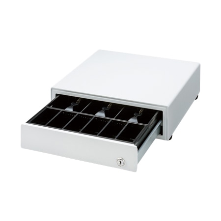 タブレットPOSシステムに最適な小型キャッシュドロアー。ボディーカラー:ホワイト。金種:3札6硬貨。外形寸法:W330×D330×H101mm/質量約5kgの省スペース設計で、カウンタースペースを有効活用できます。硬貨部分は仕切り板を動かして自由にレイアウト変更が可能です。