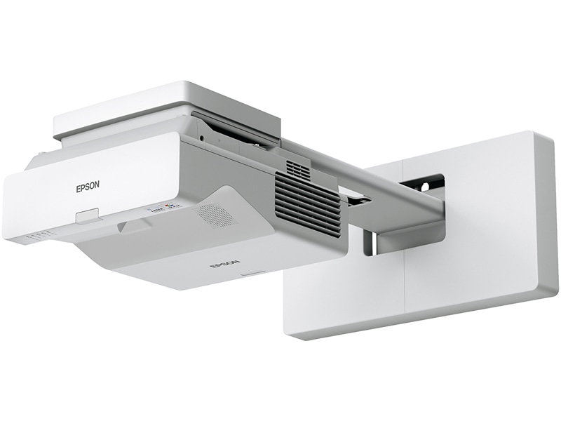 設置スペースを取らない、超短焦点壁掛けモデル。蛍光灯下の明るい教室でも綺麗に投写可能な明るさ4100ルーメン、WXGAモデル。iPadやiPhone、Android端末上の書類や画像を、無償アプリケーション「Epson iProjeciton」を通じてワイヤレスで投写が可能。フットスペースがほぼ不要で大画面を実現。