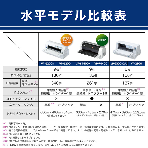 幅広い業務に応えるビジネス機のスタンダードモデル。136桁水平型、9枚複写(オリジナル+8枚)。ネットワーク標準。漢字高速モード261字/秒で前機種のVP-4300より約20%印字速度がアップ。また操作性抜群の1.44インチカラーLCDパネルを搭載。わかりやすい日本語表記で、エラー表示などプリンターの状態が一目で確認でき、給紙方法や用紙種類も設定がカンタンです。国際エネルギースタープログラム適合。消費電力を大幅に削減し省エネに貢献します。