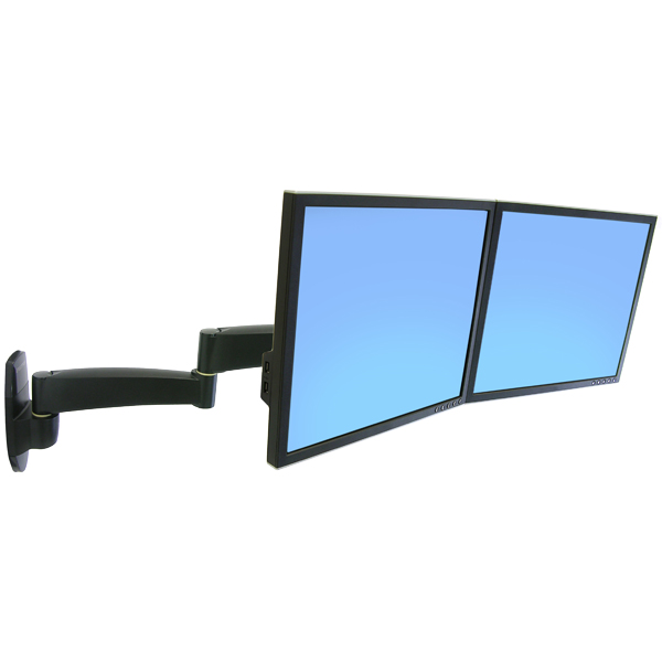 200シリーズ デュアル モニター アーム 200シリーズの連動設計は、伸縮調整を可能にします。58cmの可動範囲内でモニターを簡単に伸長・収納できます。