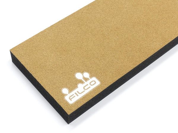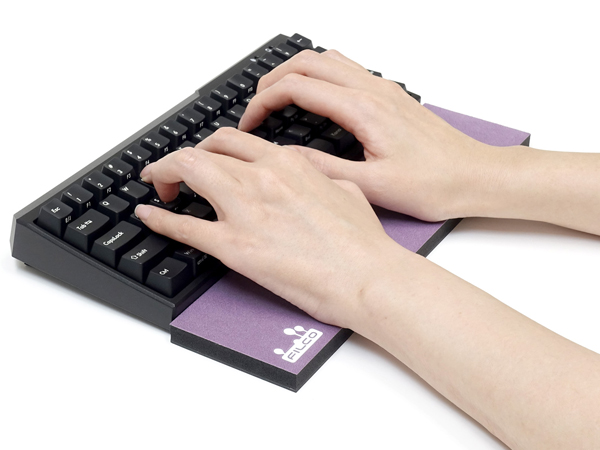 リストレストは手や肌に直接触れる製品です。使用する素材は最高品質のものに限定し、日本国内で生産しています。手や肌が直接触れる上面素材には、上質のスエードを思わせる柔らかで肌触りの良い「UltrasuedeR」を使用しました。またベース部分と底部にはそれぞれ特性が異なるマイクロセルポリマーシートを採用し、究極の使い心地を実現しました。ベース部分のマイクロセルポリマーには弾力に富みエネルギー吸収性が高い素材を、底部には低密着かつグリップ力の高い素材を採用しました。適度な弾力性と機能性を併せ持った、使い心地のよいリストレストに仕上げました。また圧縮残留歪が非常に小さいのでヘタリに強く、高い品質を長くキープできます。