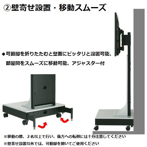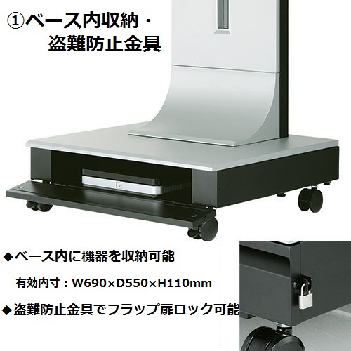 (1)ベース内収納が可能です。有効寸法W690×D550×H110(ミリ)市販の南京錠で扉部分をロックできます。(吊り部の太さは6ミリまで)(2)壁寄せ設置が可能です。可動脚を折りたたむと壁面にピッタリと設置可能。(注意:壁寄せ設置以外では可動脚を開いてご使用ください。) ~80V型用/上下調節80ミリピッチで3段階調節可能/角度調節:前方5度・12度、後方7度・14度 【2梱包製品/2梱包目 重量18.0㎏ サイズ 485(縦)× 1650(横) ×90(高さ)㎜】