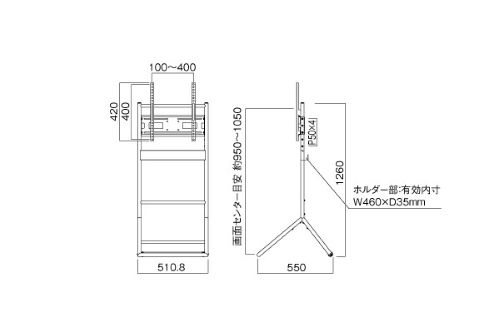 ~55V型まで イーゼルタイプ、ディスプレイ高さ調整:50mmピッチ3段階可能 垂直型 収納ホルダー付 後部ローラーキャスター 折りたたみ可