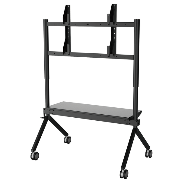 対応ディスプレイサイズ~86インチ、~80kg。電源不要のハンドル昇降タイプ。逆Y字脚が特徴で、教壇を跨げるスタンド。幅広棚板を1枚標準装備。