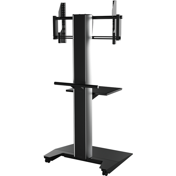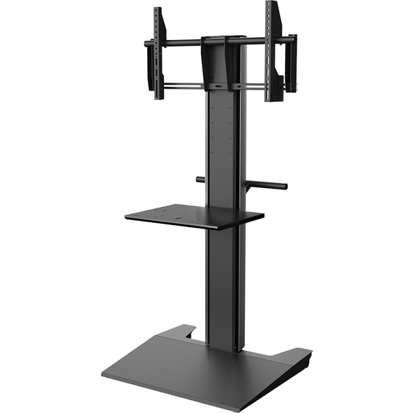 対応ディスプレイサイズ~75インチ、~40kg。室内移動用に低床キャスターを搭載。業界初!ガルウィング式コード収納で背面に回らず配線処理が可能。棚板1枚(サテンブラック色)付き。