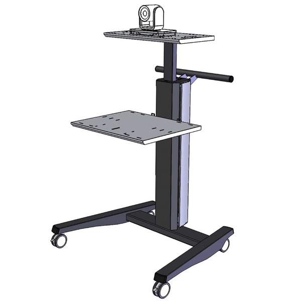 ビデオ会議用カメラの独立設置。高さ調整可能。移動用の水平ハンドルを標準装備。直径75mmキャスター。業界初!ガルウィング式コード収納で背面に回らず配線処理が可能。棚板1枚付き。