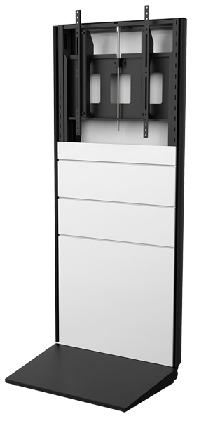 対応ディスプレイサイズ55~75インチ、~60kg。Microsoft Teams Rooms機器収納にも最適な壁寄スタンド。壁から離しても使える自立モデル。棚板は付属しておりませんが、背面パネルは標準品としてスタンドと同色のものが付いております。壁寄スタンドにも、サイネージにも。
