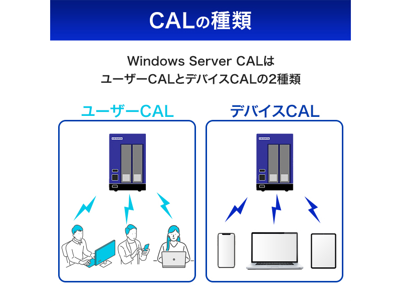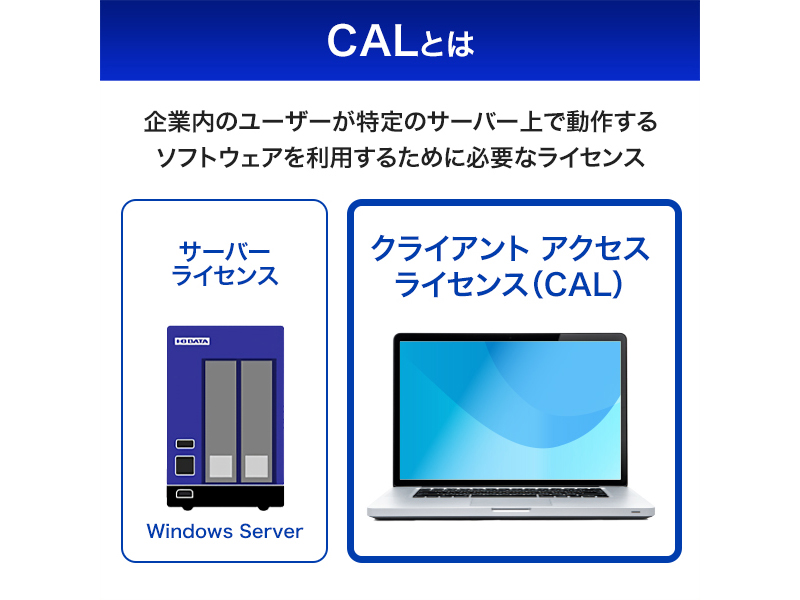 ■Windows Server 2025 で使用できるCAL(Client Access Licence)です。ユーザーCALとデバイスCALをご用意しました。アイ・オー・データ機器製アプライアンスBOX(APS2-WS22SI3B/32、APS2-WS22SI3)をお持ちの方もこちらのCALをご利用ください。■CALとは、Client Access License(クライアント アクセス ライセンス)の略で、ソフトウェアの利用権を表す用語です。CALは、企業内のユーザーが特定のサーバー上で動作するソフトウェアを利用するために必要なライセンスです。