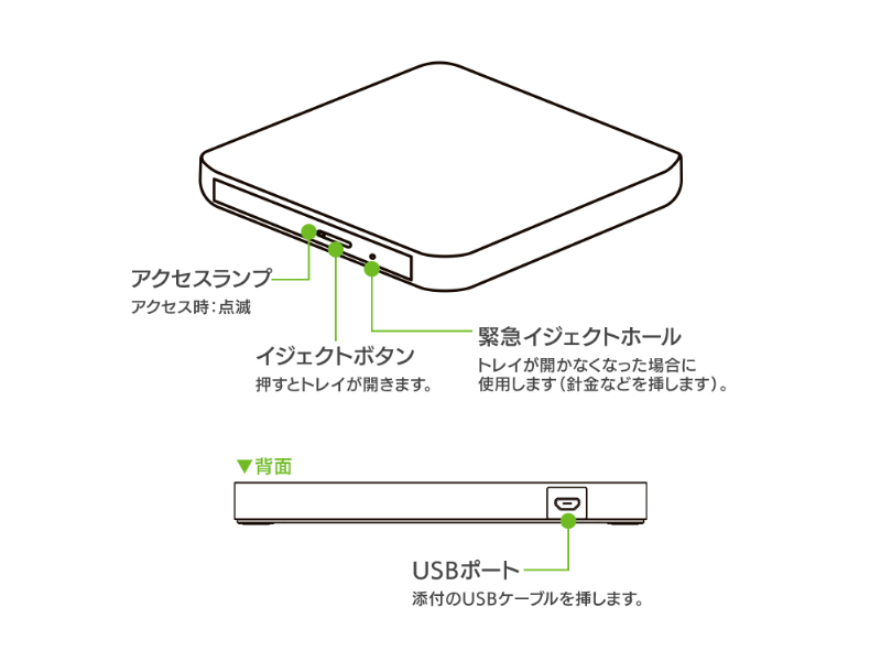 | 使用可能メディア(Read) | M-DISC(DVD)、DVD+R(1層)(2層)、DVD+RW、DVD-R(1層)(2層)、DVD-RW、DVD-RAM、DVD-ROM(1層)(2層)、CD-R、CD-RW、CD-ROM |