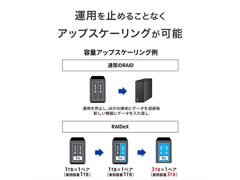 | RAID仕様 | RAIDeX(拡張ボリューム)、RAID 0、RAID1※出荷時:RAIDeX(拡張ボリューム) |