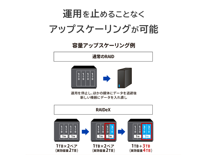 | RAID仕様 | RAIDeX(拡張ボリューム)/RAID 0/RAID 5/RAID 6※出荷時はRAIDeXに設定されています。 |