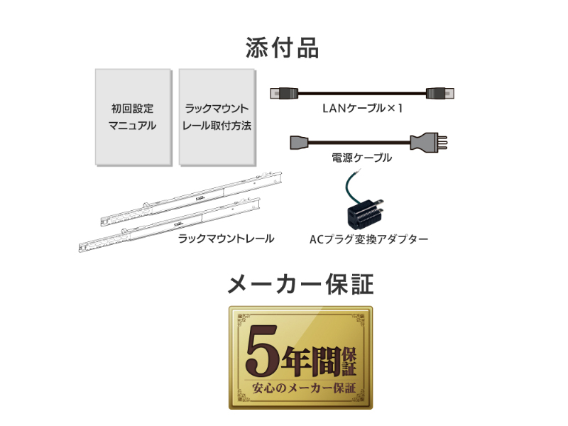 | 附属品 | 初回設定マニュアル、ラックマウントレール取付方法、電源コード(PSE適合品)x1、ACプラグ変換アダプター、LANケーブルx1 |