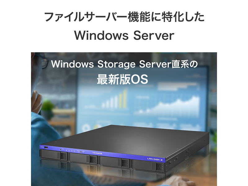 ■Windows Server IoT 2025 for Storage Workgroupをインストールした法人向けNASです。50名以下の小規模オフィスにおけるデータ共有やバックアップデータの保管に最適なソリューションを提供します。標準添付のラックレールは、オイルレス・スクリューレス仕様。■「Windows Server IoT 2025 for Storage」は、Windows Server 2025をベースとしたファイルサーバー専用のOSです。法人向けNAS筐体にインストールされ、Windows Server 2025のファイルサーバーを構築する場合と同等の環境をご提供します。■取り付けに必要なラックマウントレールを標準添付し、使用する潤滑油を減らすことで、はじめての方でも簡単に手を汚すことなく取り付けられるようにしました。米国EIA(米国電子工業会)の規格に準拠した19インチ1Uラックマウント対応。■お客様により長く、安心してNASをご利用いただくために、高い保証レベルでの安心を実現した「5年保証」+「データ復旧サービス」を標準添付いたしました。