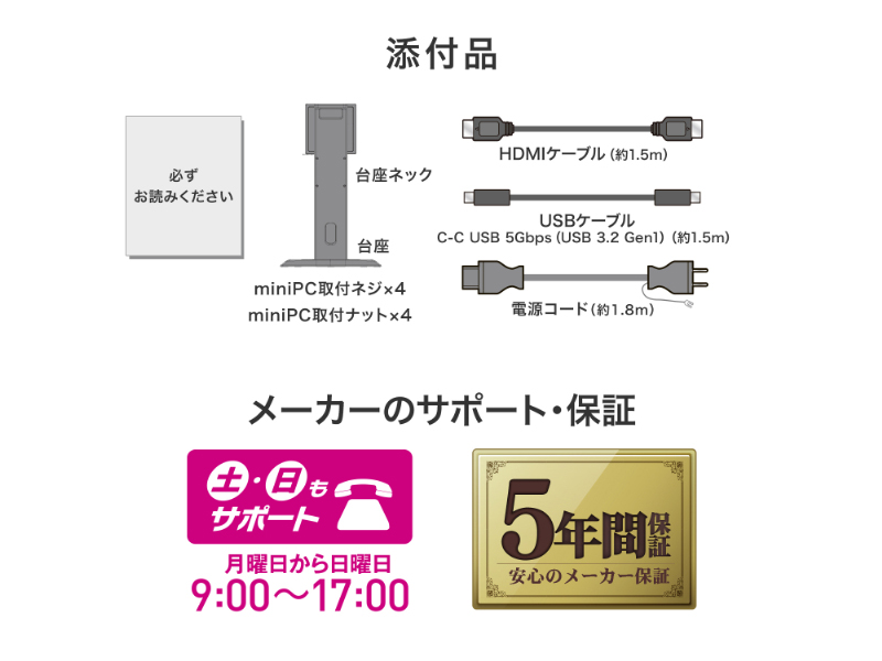 | ケーブル | 電源コード(PSE適合品、約1.8m)、HDMIケーブル(約1.5m)、USBケーブル(C-C USB 5Gbps(USB 3.2 Gen1)約1.5m) |