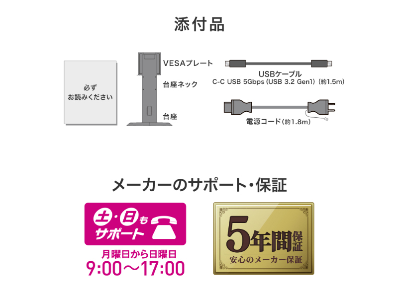 ケーブル 電源コード(PSE適合品 約1.8m)、USBケーブル(C-C USB 5Gbps(USB 3.2 Gen1) 約1.5m)