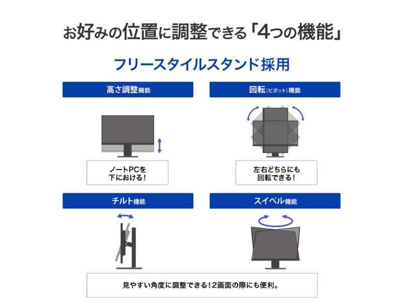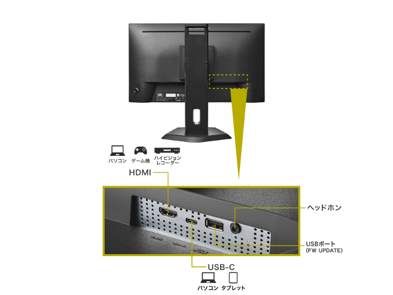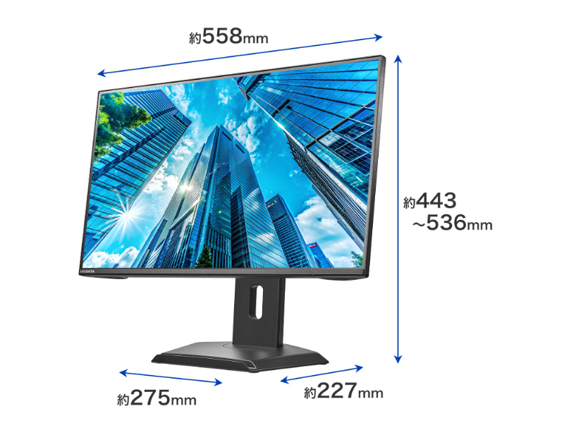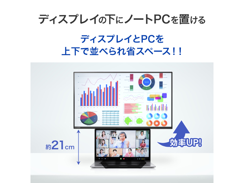 輝度:300cd/m2/応答速度:5ms/最大消費電力:104W/■ワンタッチで取り付け可能なフリースタイルスタンドを採用した、24.5型のワイド液晶ディスプレイです。スタンドは150mmまで高さ調整できるので、ノートPCと上下に並べて配置することで、省スペースで使用できます。■高さや角度を見やすい位置に調整できるので、目や肩の疲れやストレートネック対策の1つとしても効果的です。可動域が広く、ディスプレイの下に15型クラスのノートPCを置けるので、省スペースで快適です。■スタンドのネックにminiPCや小型パソコンを取り付けるminiPCアタッチメントホール、台座にはスマホやキーボードなどを立てかけられるスリットを、ネックには移動に便利な持ち手と、ケーブルをスッキリとまとめられるケーブルホルダーを搭載しました。■ノートPCをUSB Type-Cケーブルで接続することにより、映像や音声の入力、ノートPCへの給電および充電がケーブル1本で行われ、使用するコンセントも最小限に抑えられます。打ち合わせはもちろん、出張や外出時もケーブル1本抜くだけでノートPCをすぐ持ち出せます。