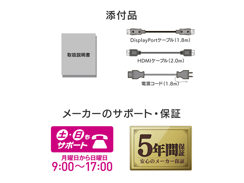 | ケーブル | DisplayPortケーブル(1.8m)、HDMIケーブル(2.0m)、電源コード(1.8m、PSE適合品) |