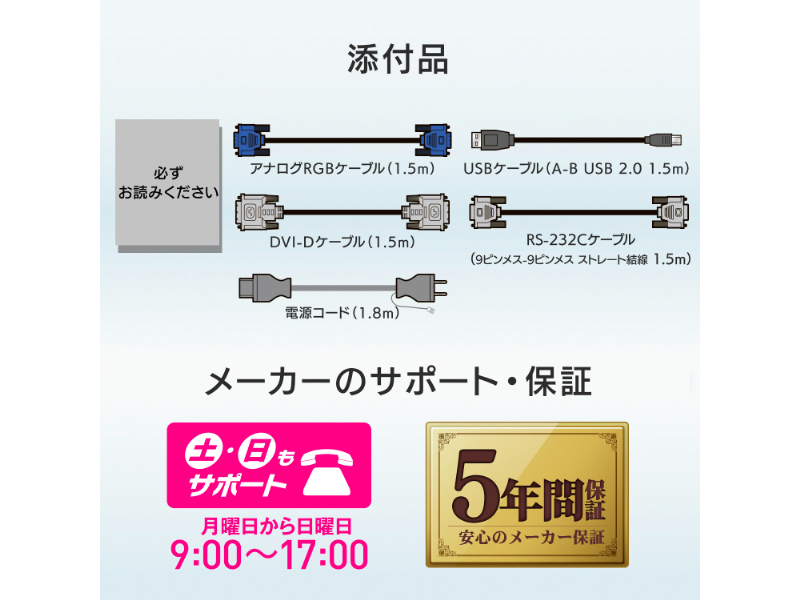 | ケーブル | 電源コード(1.8m、PSE適合品)、アナログRGBケーブル(1.5m)、DVI-Dケーブル(1.5m)、USBケーブル(A-B USB 2.0 1.5m)、RS-232Cケーブル(9ピンメス-9ピンメス ストレート結線 1.5m) |