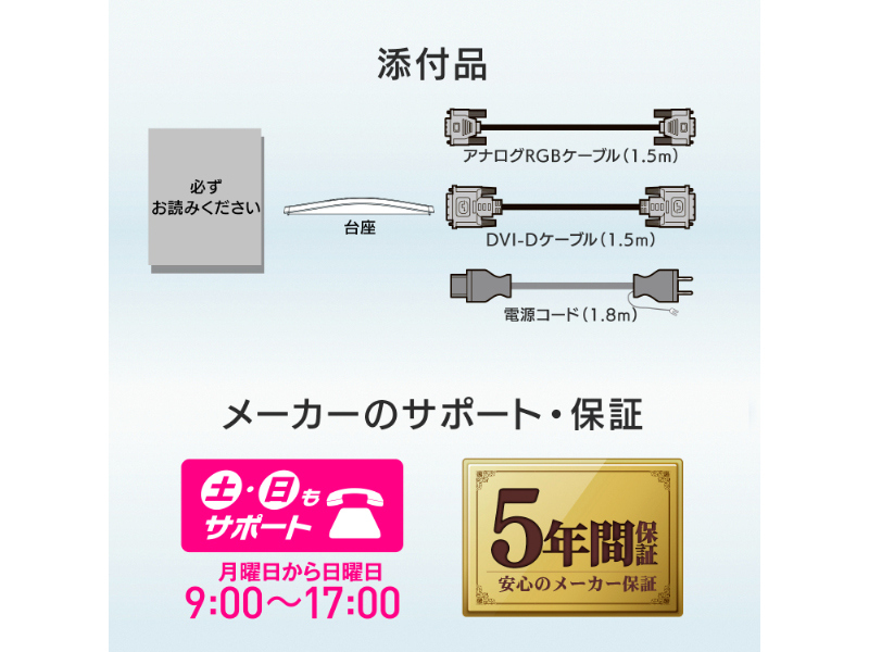 | ケーブル | 電源コード(1.8m、PSE適合品)、アナログRGBケーブル(1.5m)、DVI-Dケーブル(1.5m) |