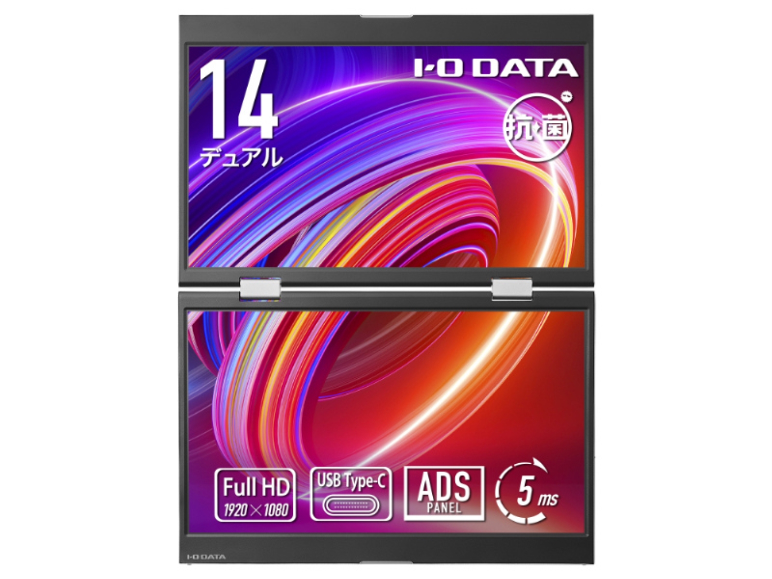 輝度:250cd/m2/応答速度:5ms/最大消費電力:15W/■14型液晶パネルを2画面搭載したデュアルモバイルディスプレイです。フルHD(1920×1080)解像度のパネルを2面搭載し、ノートPCと組み合わせることで、省スペースで最大3画面のマルチディスプレイ環境を構築できます。表示モードは拡張・複製・大画面の3種類を搭載。■ナノソリューション株式会社のSIAA取得済み光触媒コーティング剤「ナノディフェンダーAg(+)(R)」を塗布したモデルをご用意しております。アルコール除菌に比べ、酸化チタン光触媒コーティングは持続力がとても高く、光がある限り常に光触媒作用を発揮します。■フルHD(1920×1080)の14型ディスプレイを2画面搭載しています。ノートPCと組み合わせれば、最大3画面のマルチディスプレイ環境を外出先でも再現できます。■上下2面置き、左右2面置き、対面置きの360°回転と、3種類の設置方法に対応しており、利用シーンに合わせて自由にレイアウトできます。