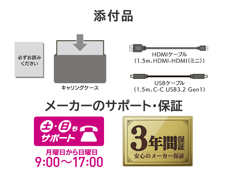 ケーブル HDMIケーブル(1.5m、HDMI-HDMI(ミニ))、USBケーブル(1.5m、C-C USB 3.2 Gen1)