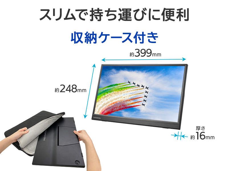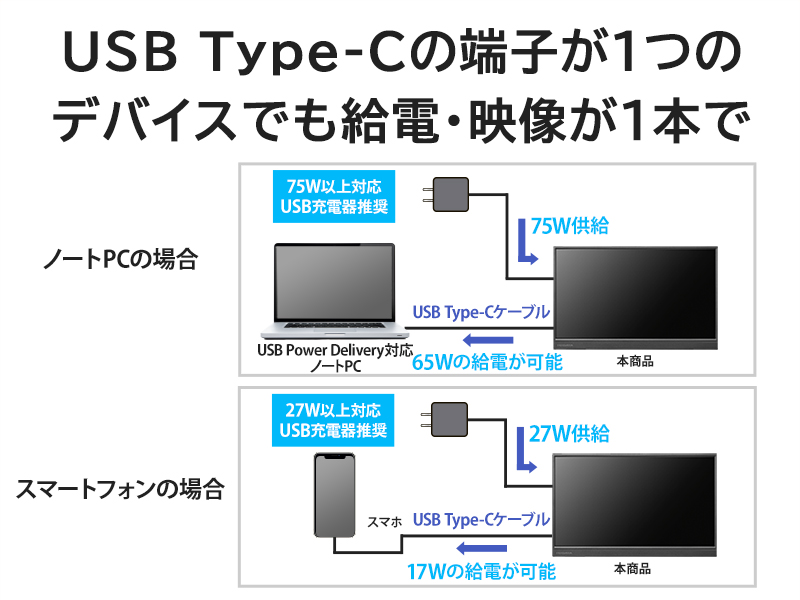 輝度:220cd/m2/応答速度:5ms/最大消費電力:7.5W/■17.3型モバイルディスプレイです。USB Type-Cなら映像出力と給電をケーブル1本で行うことができます。また、スリムな筐体なので手軽に持ち運びできサッと片づけられるため便利です。高さ・角度調整・回転対応の「スタンドセット」もラインアップ。■ナノソリューション株式会社のSIAA取得済み光触媒コーティング材「ナノディフェンダーAg(+)(R)」を塗布したモデルをご用意しております。アルコール除菌に比べ酸化チタン光触媒コーティングは持続力がとても高く、光がある限り常に光触媒作用を発揮します。■テレワークや外出先でノートパソコンさえあれば仕事はできるが画面が小さいためどうしても業務の効率が上がらないと感じている方におすすめのモバイルディスプレイ。コンパクトながらもフルHDの解像度があるので、これ1台をつなぐだけで作業領域が広がり、業務効率がアップします。■USB Type-Cディスプレイ給電に対応しているので、添付しているUSB Type-Cケーブルで接続することにより、パソコンからの映像出力と給電がケーブル1本で行われます。 電源コンセントに繋ぐ必要がないため、どこでも好きな場所でお使いいただけます。