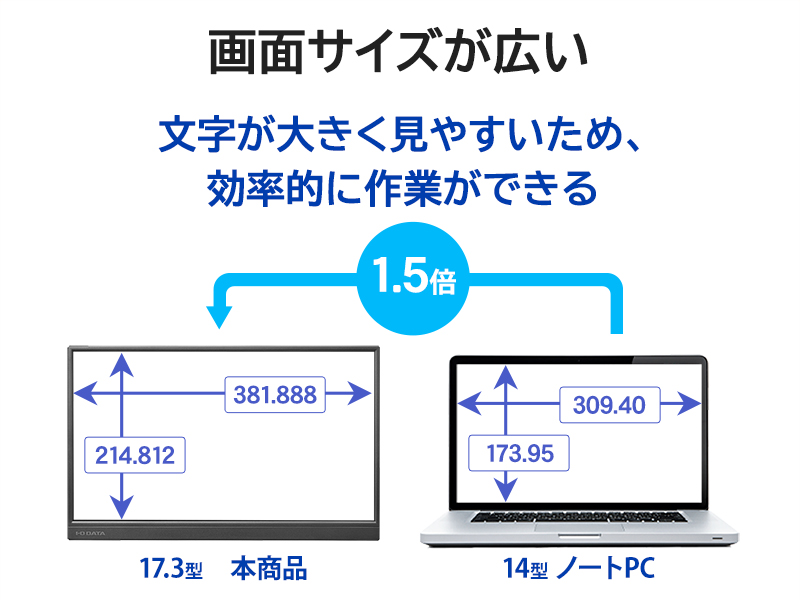 商品名 モバイルディスプレイ 17.3型/1920×1080/HDMI(ミニ)、USB Type-C(DisplayPort Alt Mode)/ブラック/スピーカー:なし/画面サイズが大きく、業務効率アップ!/抗菌