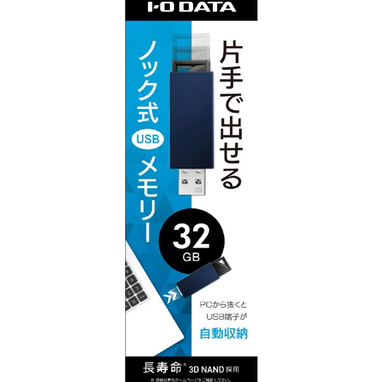 ■片手でカチッとUSBコネクターを出せるUSB 3.0対応USBメモリーです。パソコンのUSBポートに挿すときは、片手でカチッとプッシュするだけ。また、パソコンから抜くと自動でUSBコネクターが収納され、かんたん&便利にお使いいただけます。カラーは、4色をご用意。■片手でワンプッシュするだけでパソコンのUSBポートに接続できるノック式USBメモリーです。先端のノック部分をカチッと押せば内部のコネクターが出てくるため、片手の操作でもとっても簡単です。また、パソコンから抜くとコネクター部分が自動収納されます。■ホワイト/ブラック/レッド/ブルーの4色をご用意。シンプルなデザインなので、プライベートでもオフィスワークでもさまざまなシーンでお使いいただけます。また、梨地仕上げの樹脂筺体を採用することで、その表面は傷が付きにくく持ち運びに最適です。※ノック部分を除く。■USB 3.0の最大転送速度(規格値)は5Gbps。従来のUSB 2.0の最大転送速度480Mbps(規格値)の約10倍以上です。 本商品はUSB 3.0を搭載し、高速な転送性能を実現しています。