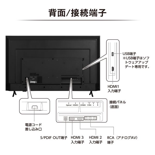 | 入力端子 | HDMI×3、USB2.0×1、S/PDIF×1,AV IN×1、AUDIOOUT×1 |