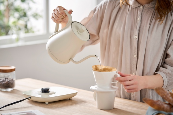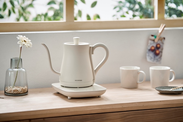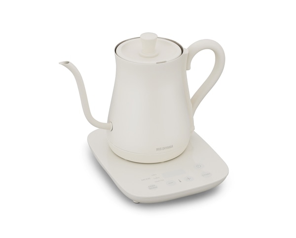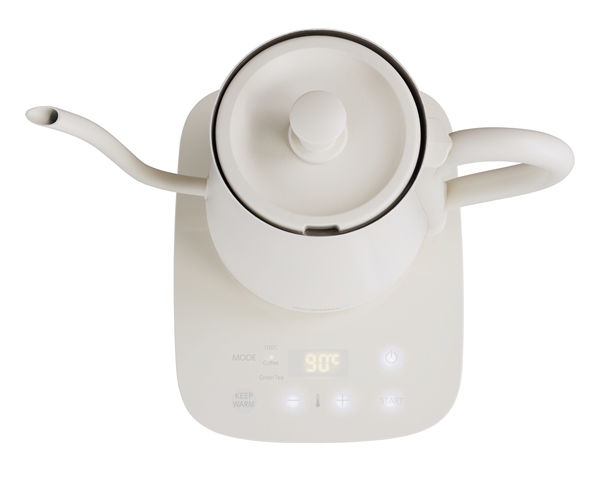 NumberSeriesでカラーを統一した新生活応援商品です。ティーポットのようなアンティーク調のデザインなので、置いているだけでインテリア性が高い電気ケトルです。注ぐお湯の量をコントロールしやすく注ぎやすいので、コーヒーや紅茶を入れるのに最適です。温度調節機能付きで、60℃~100℃まで5℃刻みでの温度調節や保温温度(60℃~95℃)も調節が可能です。自動メニューボタン付き(MODE)で、ボタンひとつでコーヒーやお茶に合った温度で沸かせます。お湯が沸騰すると自動でスイッチが切れる自動電源オフ機能があるので安心です。容器内が空の状態で電源スイッチを入れても、電源が自動的に切れる空焚き防止機能を搭載しています。本体と電源プレートがセパレート式になっているので、本体の持ち運びがしやすいです。